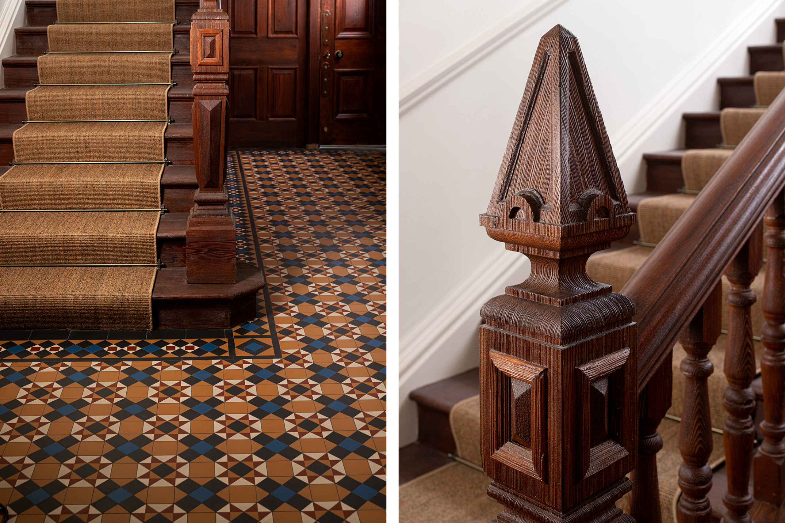 Restorations to original windows, doors, and fireplaces were complemented by new timber cladding and secondary glazing, with ongoing works throughout the house.